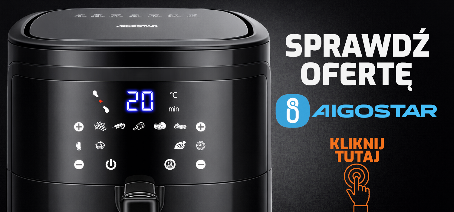Cena 59,99 złFrytkownica beztłuszczowa Aigostar z cyrkulacją powietrza 360°, dotykowym panelem LED i wyjmowanym koszem z nieprzywierającą powłoką.